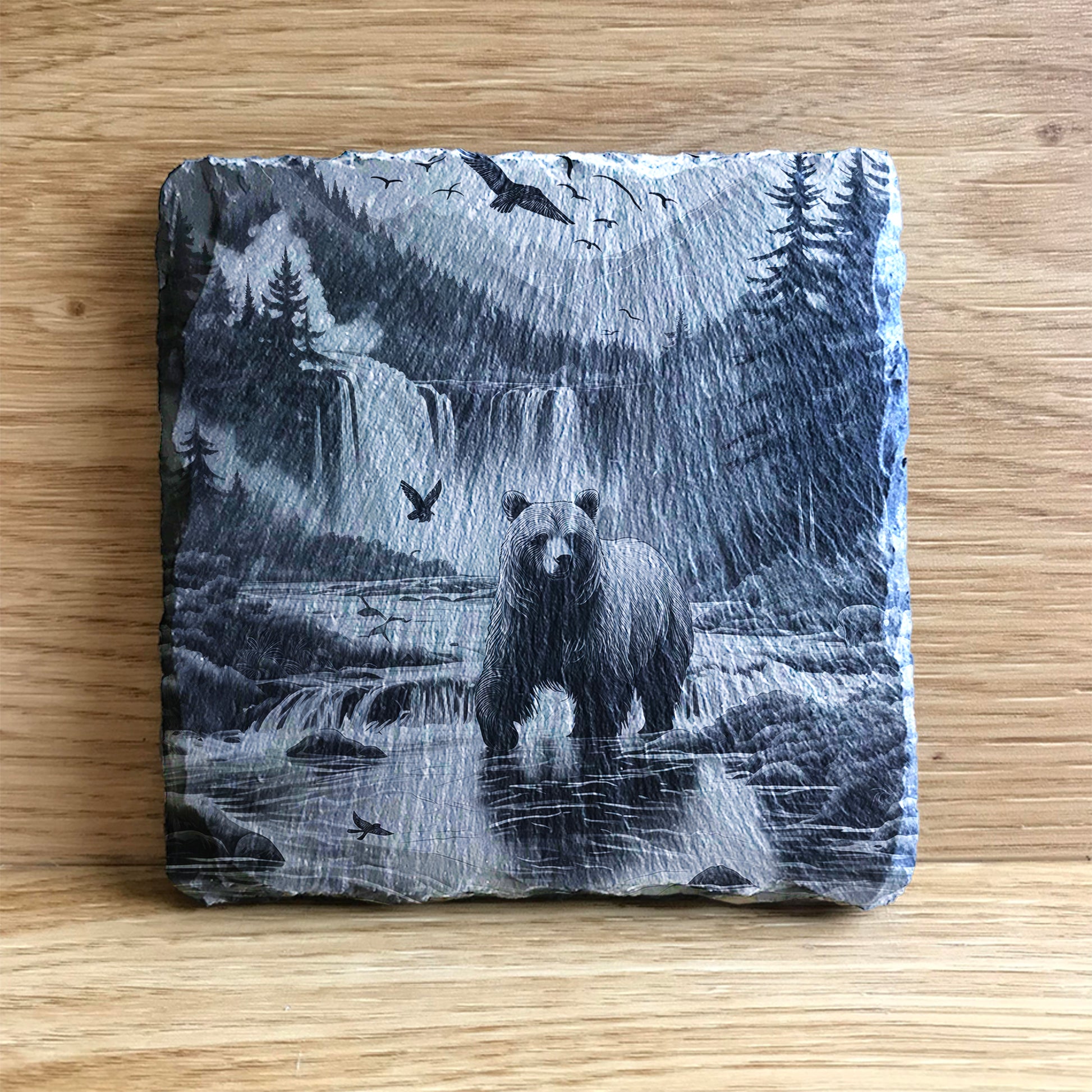 Grizzly bear looking for fish in a stream stone slate coaster.